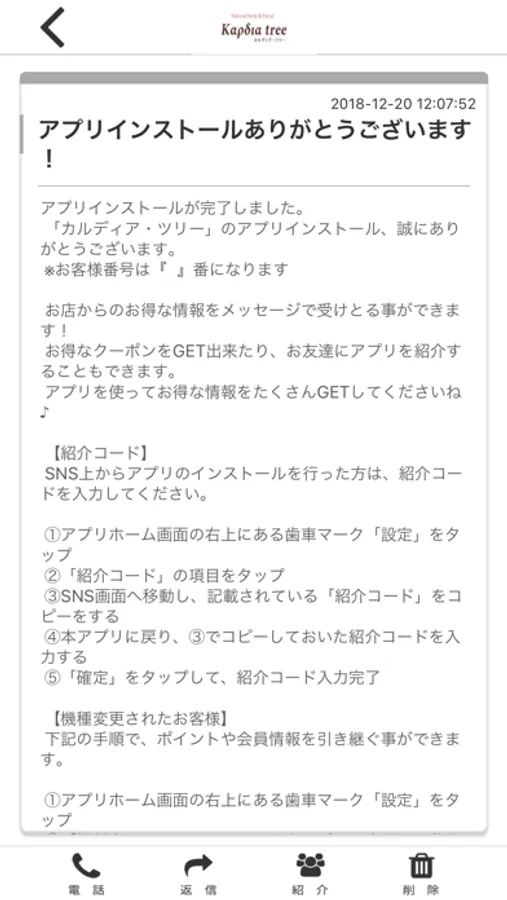 カルディア・ツリーのアプリをSNSを通じてお友達に紹介する事ができます。