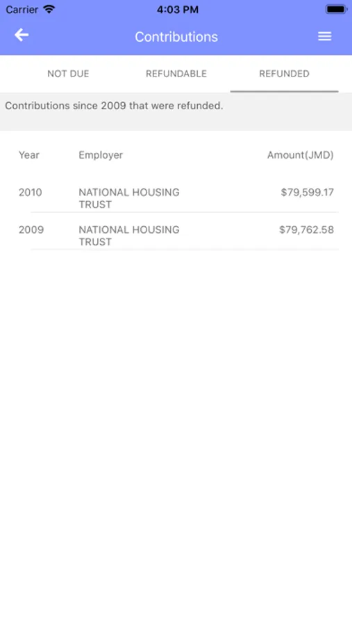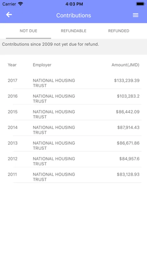 See your contributions to the NHT at a glance. Contributions are displayed as due for payment, not due for payment and refunded.
