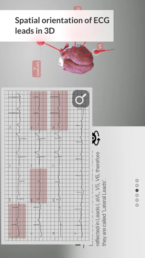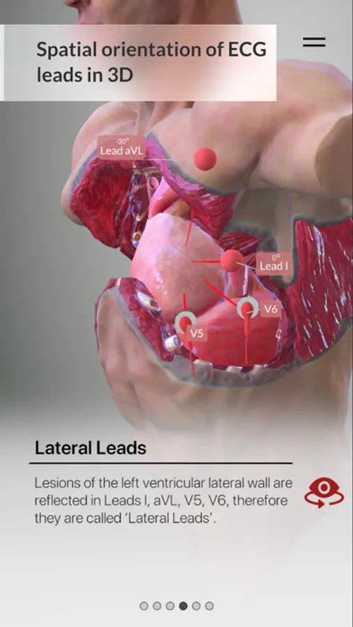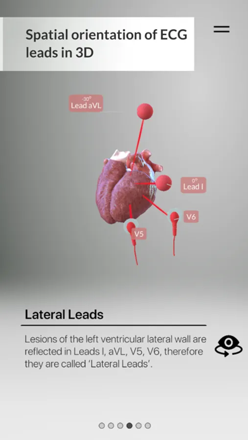 In a standard 12 Lead ECG Tracing, not all of the ECG Leads are organized in anatomical order. One recent study (Lindow et al., 2019) highlights the fact that displaying all the 12 ECG Leads in an anatomical sequence has a positive impact in diagnosing Acute Myocardial Infarction. 3D ECG Leads serves as a 3D interactive tool for the anatomical visualization of the ECG Leads.