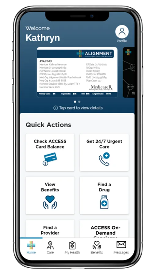 The Alignment Health Plan member app is your secure mobile gateway to your health information. In conjunction with ACCESS On-Demand Concierge, our newest program offering all members a concierge health care experience, our app is designed to make your health care accessible anywhere, at any time.