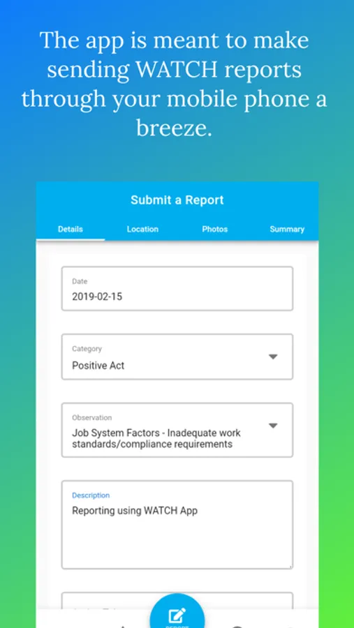 The application is a digital version of the WATCH Card. The app is meant to make sending WATCH reports through your mobile phone a breeze and get information of its close-out progress through the application.