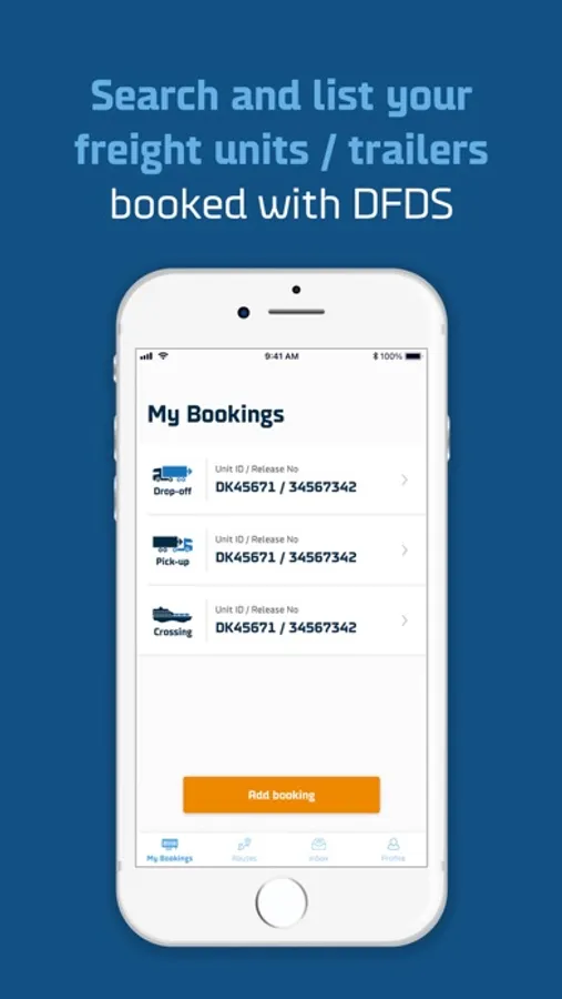 Enter release number and unit ID to store the units that you need to pick up from or deliver to DFDS terminals. List bookings and remove them when you complete your task.