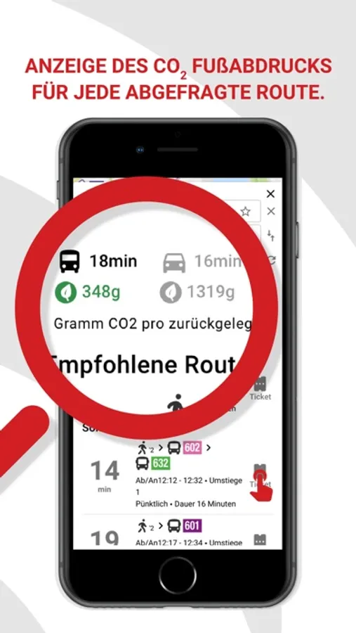 Damit Sie bei der Klimawende immer den nachhaltigsten Weg finden, wird zu jeder Routenabfrage der zugehörigen CO2 Fußabdruck ermittelt und für die Nutzung des ÖPNV, das Fahrrad, den Fußweg oder das Auto automatisch angezeigt. Nach Beendigung der Fahrten mit einem nextbike oder TIER Scooter erhält man seinen ganz persönlichen Einsparungswert angezeigt und kann dies über die sozialen Medien mit anderen teilen.