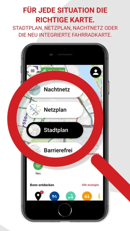 Egal ob Stadtplan, Netzplan, Nachtnetz oder die neu integrierte Fahrradkarte – wählen Sie die Karte aus, welche Ihnen in der notwendigen Situation die beste Informationsgrundlage bietet. Eine eigene Fahrrad-Sektion „mit dem Rad“ bietet neben allen Fahrradwegen und -schnellrouten alles Wichtige rund um´s Radeln in Bonn und kann mit sämtlichen anderen Mobilitätsdaten verknüpft werden.