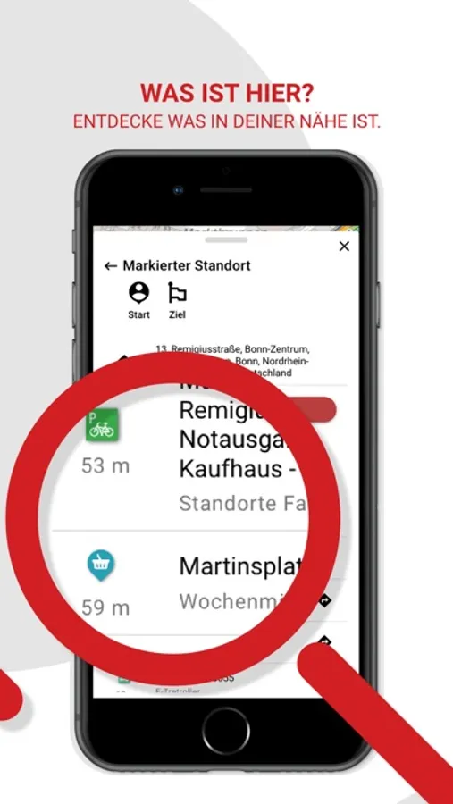 Mit jedem Klick auf die Karte erhalten Sie Informationen zum Standort sowie eine Auflistung ausgewählter Points-of-Interest (POI) im Umkreis von 500 Metern, selbstverständlich auch Haltestellen, Fahrräder, Scooter und E-Roller. Hiermit erhält man schnell und einfach einen Überblick, was sich in der Umgebung befindet und kann dies mit seinen Planungen kombinieren.