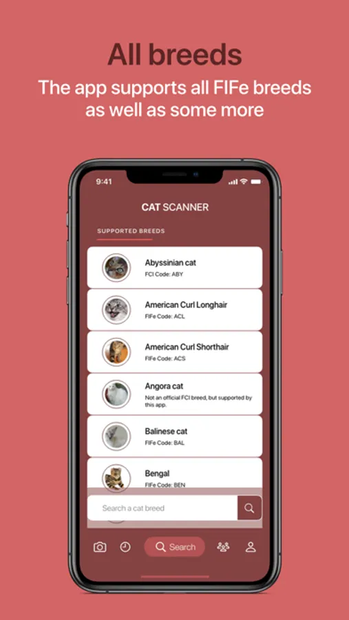 The Cat Scanner app currently identifies around 60 different cat breeds, including all breeds officially recognized by the Fédération Internationale Féline (FIFe) and even some more! Our comprehensive database with information and pictures of all cat breeds (including the unofficial ones) can also be accessed completely without scanning!