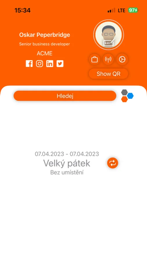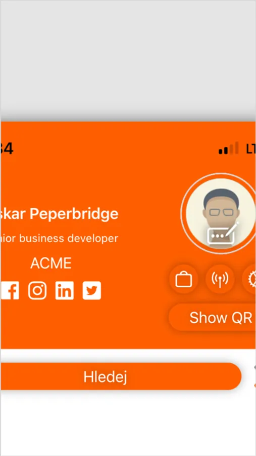 If everything is set, the user can go to search for others, this is triggered by a button in the shape of a bee. The application is able to read up to 100 other contacts, which are sorted in tabs into a scrollable list. Clicking on the avatar image on the received card will take you to the person's details screen. You can then export it back to the phone book. Clicking on social networking icons will take you directly to their profiles. If the icons are white, the user has not filled in this information.
