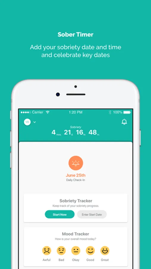 Daily Check-In - Enter your mood and how you’re feeling to track your progress in recovery. You can also write journal entries to record your accomplishments or identify triggers.