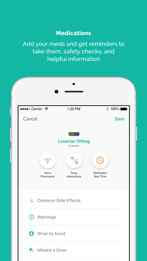 Medications – Add your meds (including medicated assisted therapy drugs) and get reminders to take them, safety checks (drug interactions, correct dose, and more) and helpful information (side effects, what to avoid, and more).
