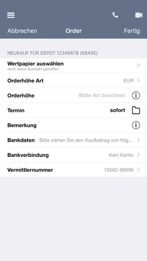 - Einreichung von Orderaufträgen direkt über die App, Bestätigung per Kennwort oder digitaler Unterschrift