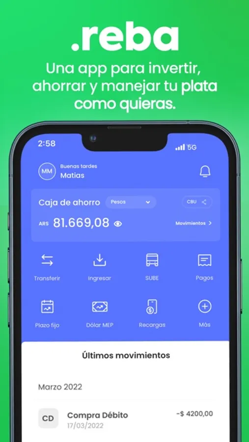 Con Reba tenés una caja de ahorro en pesos y dólares 100% bonificada y una Visa Débito para usar desde el primer momento.