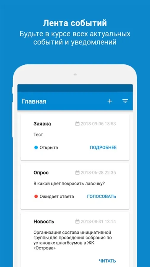 • получать push-уведомления о новых событиях, новостях, опросах, счетах и ходе выполнения Ваших заявок.