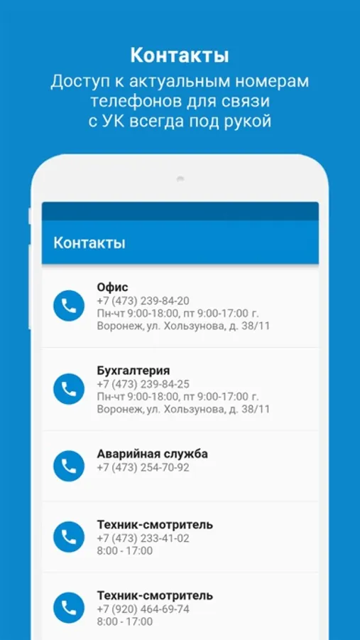 • просматривать контакты и быстро совершать звонки по актуальным телефонным номерам для связи с управляющей компанией;