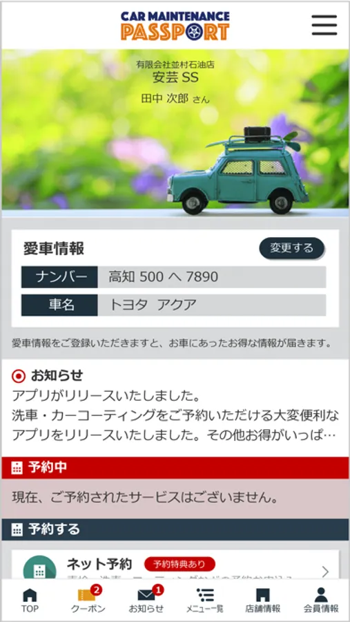 高知県安芸市のガソリンスタンド・サービスステーションである有限会社並村石油店が提供するアプリ「並村石油店 カーメンテナンス パスポート」ではアプリで簡単に洗車・コーティングなどのご予約や愛車のメンテナンス管理が可能です。