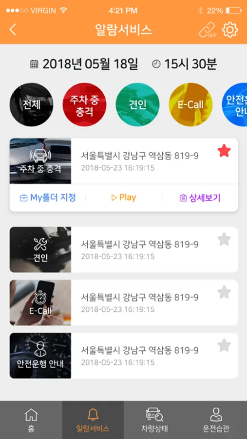 주차 중 차량 충격 발생 시 차주 스마트폰 앱으로 실시간 알람 및 충격 당시 알림을 전송해 상황을 확인할 수 있습니다.