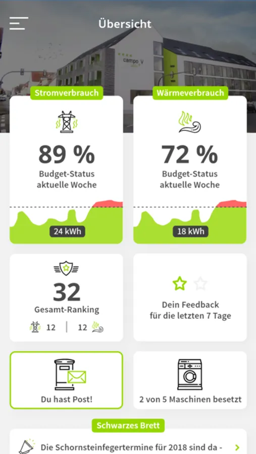 Get information about your energy use, communicate with the property management and discover additional helpful information such as the status of the washing machines and dryers.