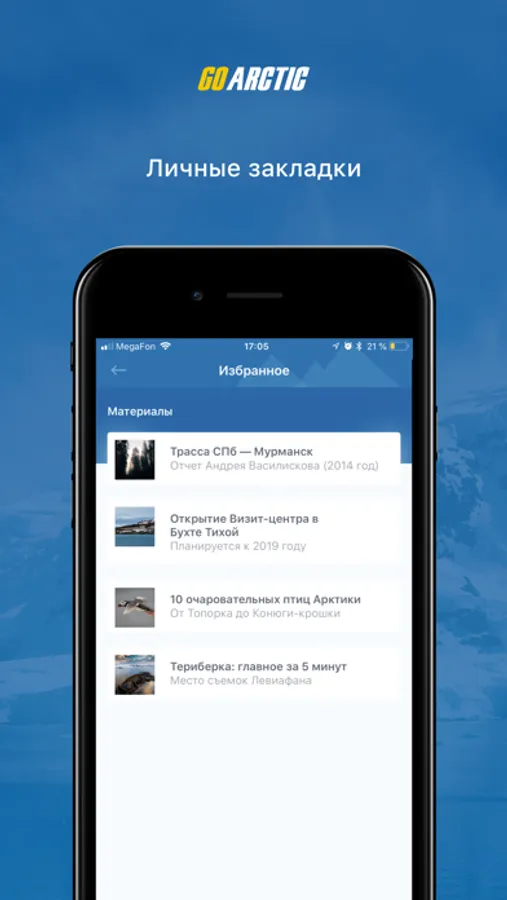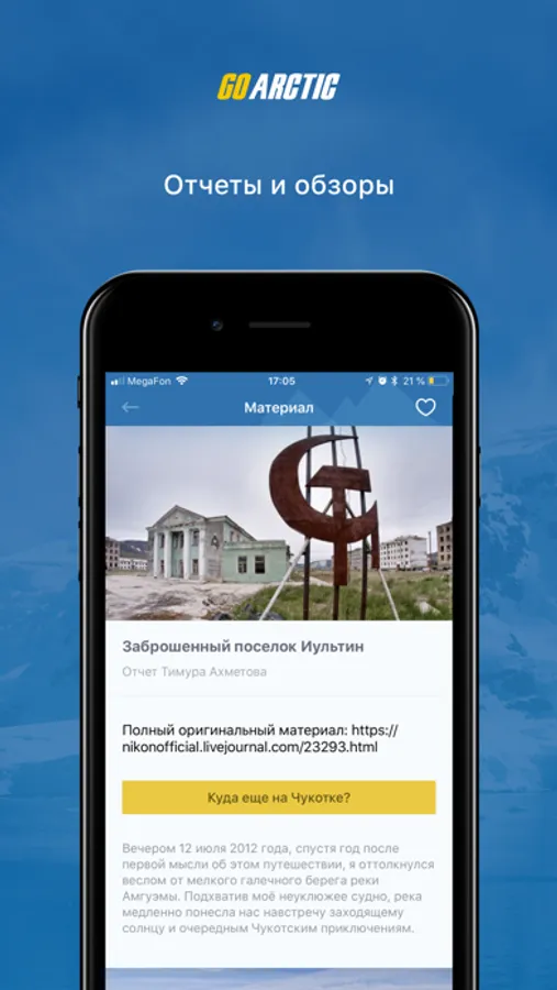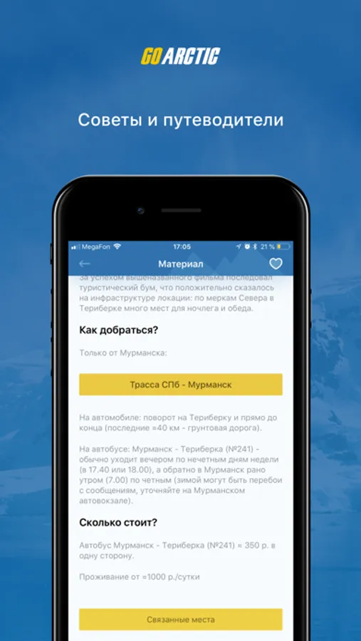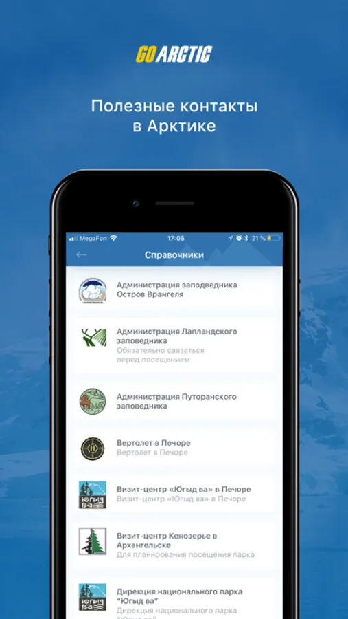 GoArctic — бесплатный справочник-путеводитель по Арктике и российскому Северу, созданный экспертами портала goarctic.ru. Деревянные церкви и шаманские села, ледники и застывшие водопады, белые медведи и нарвалы, заброшенные поселки и арктические станции — внутри есть всё, чтобы полностью окунуться в волшебный мир Арктики!
