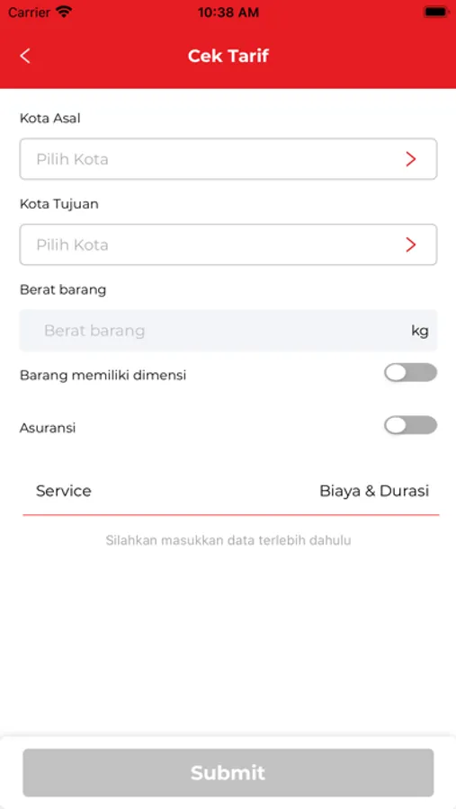2. Check Tarif : Menyajikan informasi tarif kiriman.