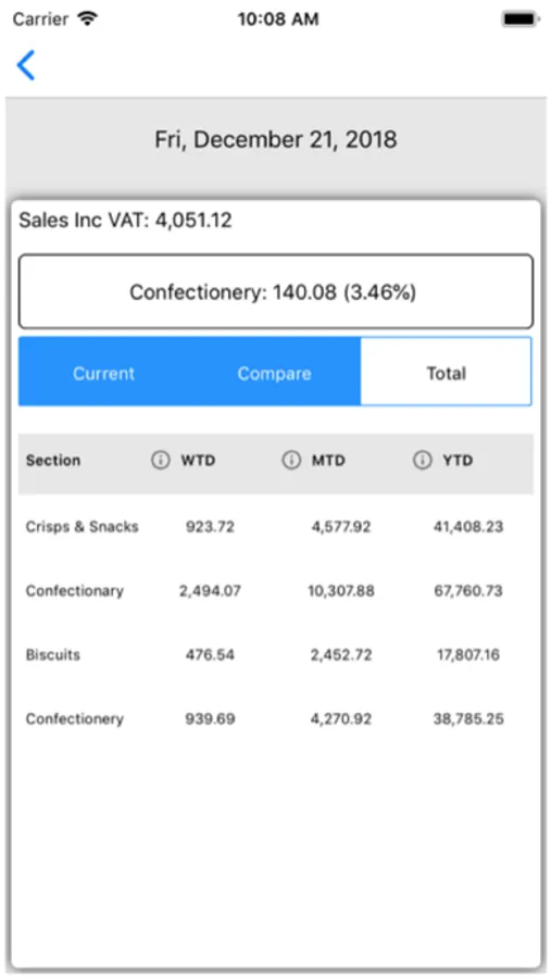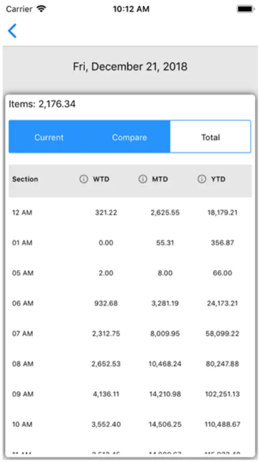 The Total section will show week to date, month to date, year to date values