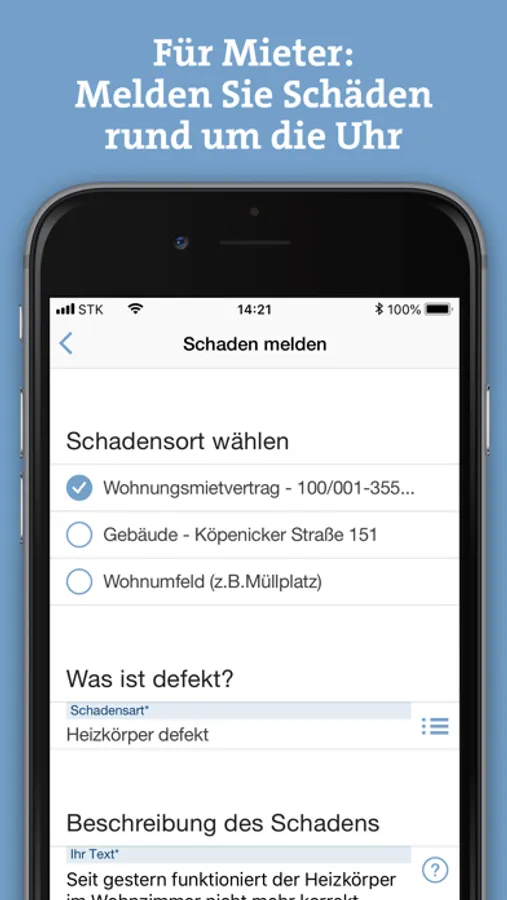 Mit der App können Sie Schäden in Ihrer Wohnung 24 Stunden am Tag schnell und bequem an uns weitergeben.