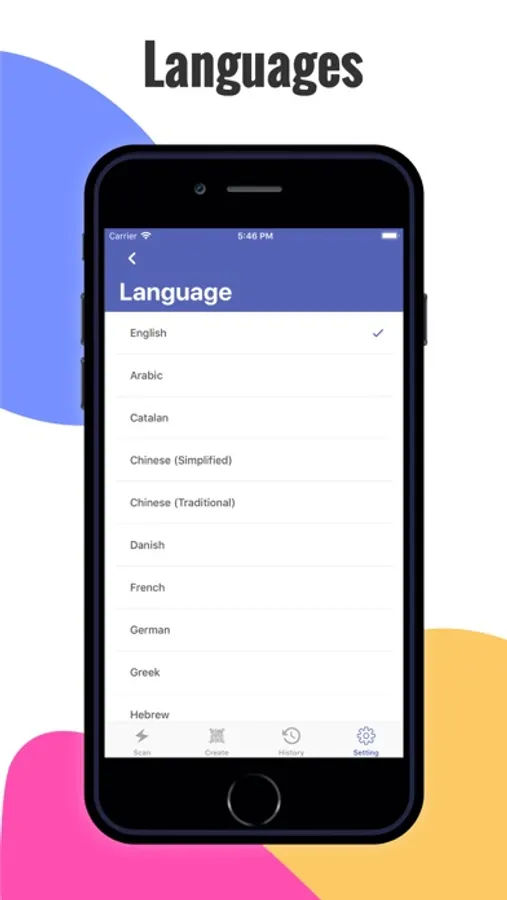 Rapid QR Code offers multiple languages like "English", "Arabic", "French", "German", "Russian", "Spanish", "Turkish", "Hindi", etc.
