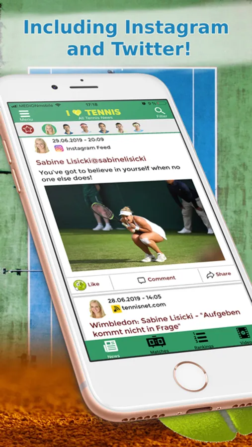 Get closer to your tennis favourite with Social Media. We show you the latest pictures from Facebook, Twitter and Instagram - direct and always up to date. In addition we offer a whole new community. Use our interactive chat to communicate with other tennis affectionates and fans from all over the world.