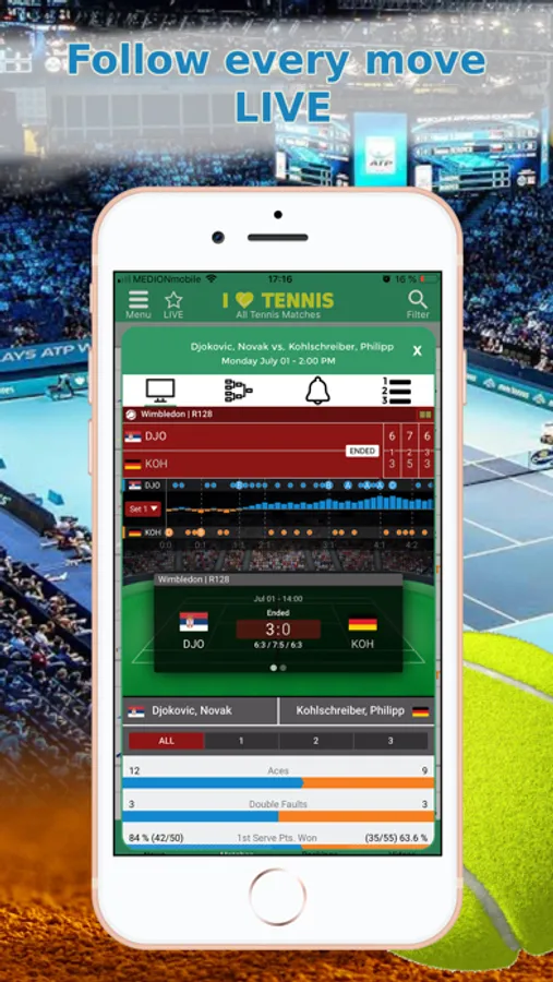 You will receive all information for every match on Wimledon's holy grass with our tennis live ticker. Or filter for your favourite tournament and choose exactly what you want to see. Everything you want to see in one place.