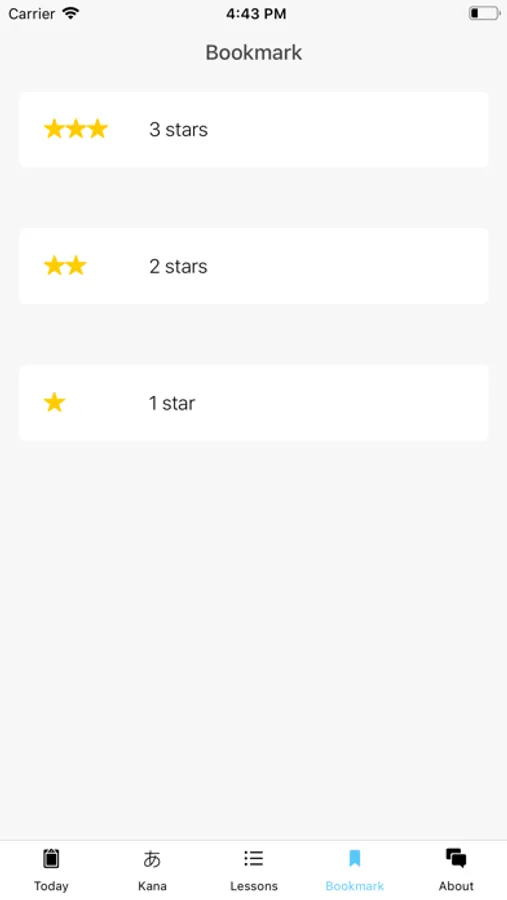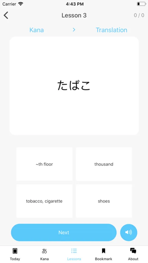 - "Listening": listen to the pronunciation and choose the correct answer, answers can be shown in Kanji, Romaji or English.
