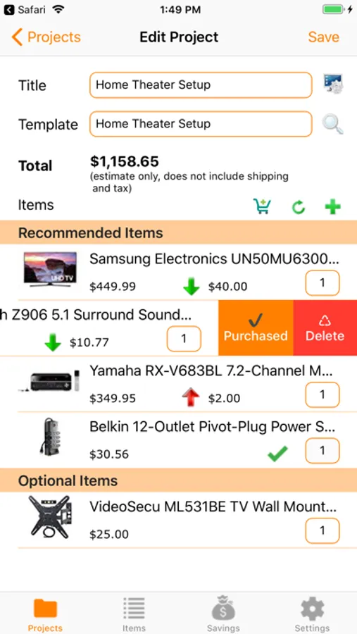 Take your shopping one level further by making goal-driven purchases using Shopping Guru projects. Have you ever wondered how to set up a cool home theater? Or that vegetable garden you always wanted. Shopping Guru takes the guesswork out and makes it easy to plan your purchases as projects by choosing from several out-of-the-box templates. Think of a template as a guide for what you should buy. For example, if you are looking to set up a home theater, choose the Home Theater Setup template. Likewise, if you were always wanting to set up a vegetable garden, but did not have the time to research what all would be needed, use the Vegetable Garden Setup template. A template makes it easy to find the items. Of course, you can always add or remove items from the project. And if you do not find a template that matches your needs directly, use the Blank Project template to create a project from scratch. Once you set up a project, the app will provide an estimated total so that you can plan your purchases. Shopping Guru will track price drops and notify you. This way, you can time your purchases and save money.