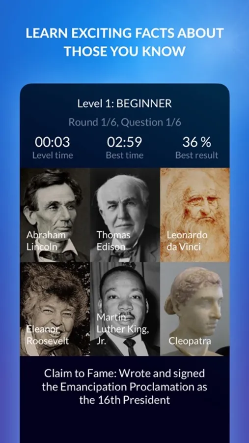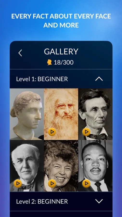 ● 100 Levels of 6 faces each to identify, increasing in difficulty