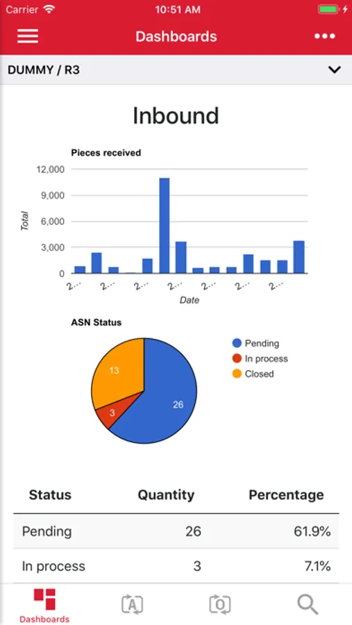 Mobile application that shows product status of the customers in the warehouses managed by Ryder. Customers can search and receive notifications of the status of pre-alerts of receipt of products (ASN), order status and stock inventory.