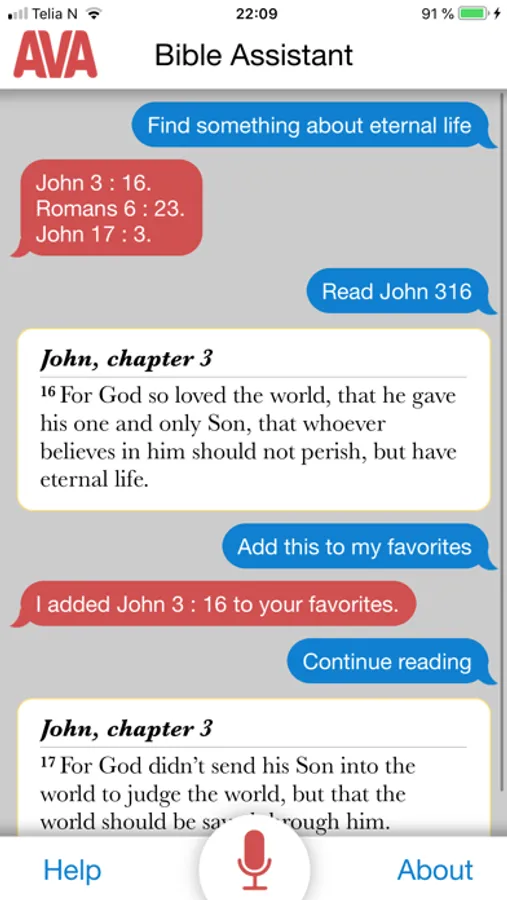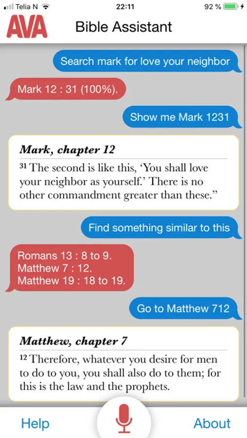 Using an Advanced Voice Assistant like AVA to navigate the Bible, is the quickest and most efficient way to find exactly what you're looking for. By speaking to AVA in a natural language, as you would to a person, you can ask for specific verses or passages, find related verses, search for topics or literal words or phrases, get explanations, and much, much more.