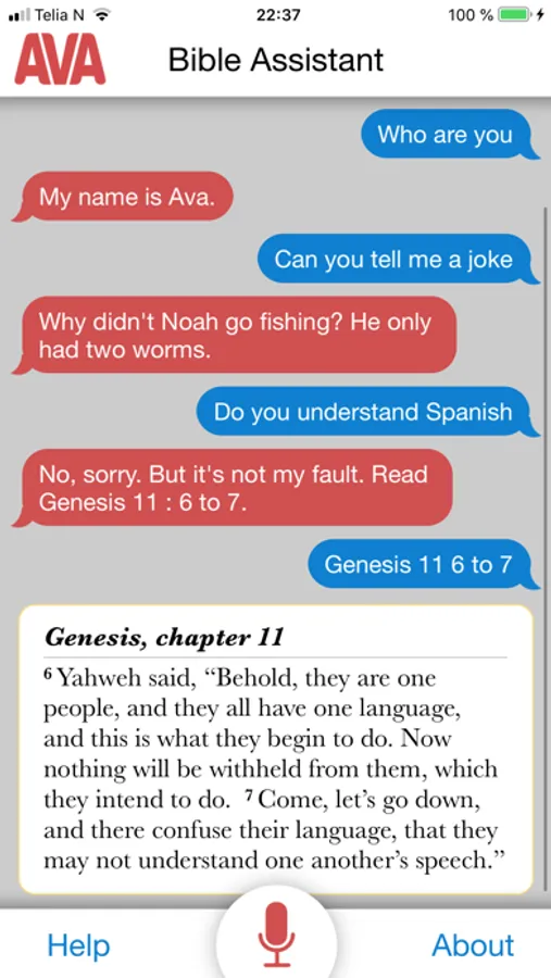 AVA is your talking, personal Bible assistant, who will help you get answers and find what you need in the Holy Scriptures. It's like having a conversation with the Bible itself!