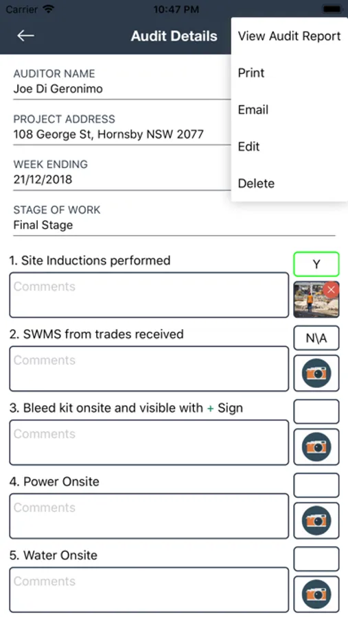 This app creates a PDF report that you can share within your OH&S reporting structure, and tradesman onsite. This App enables you to generally record current an existing conditions of your work site, enabling you to record and ensure that the Construction Site Complies, and to take action on the non-compliant items. This App Audit Report will help you continue to ensure that your site complies with Victorian OH&S Act & Regulations, and Council Requirements and Legislations in your local area.