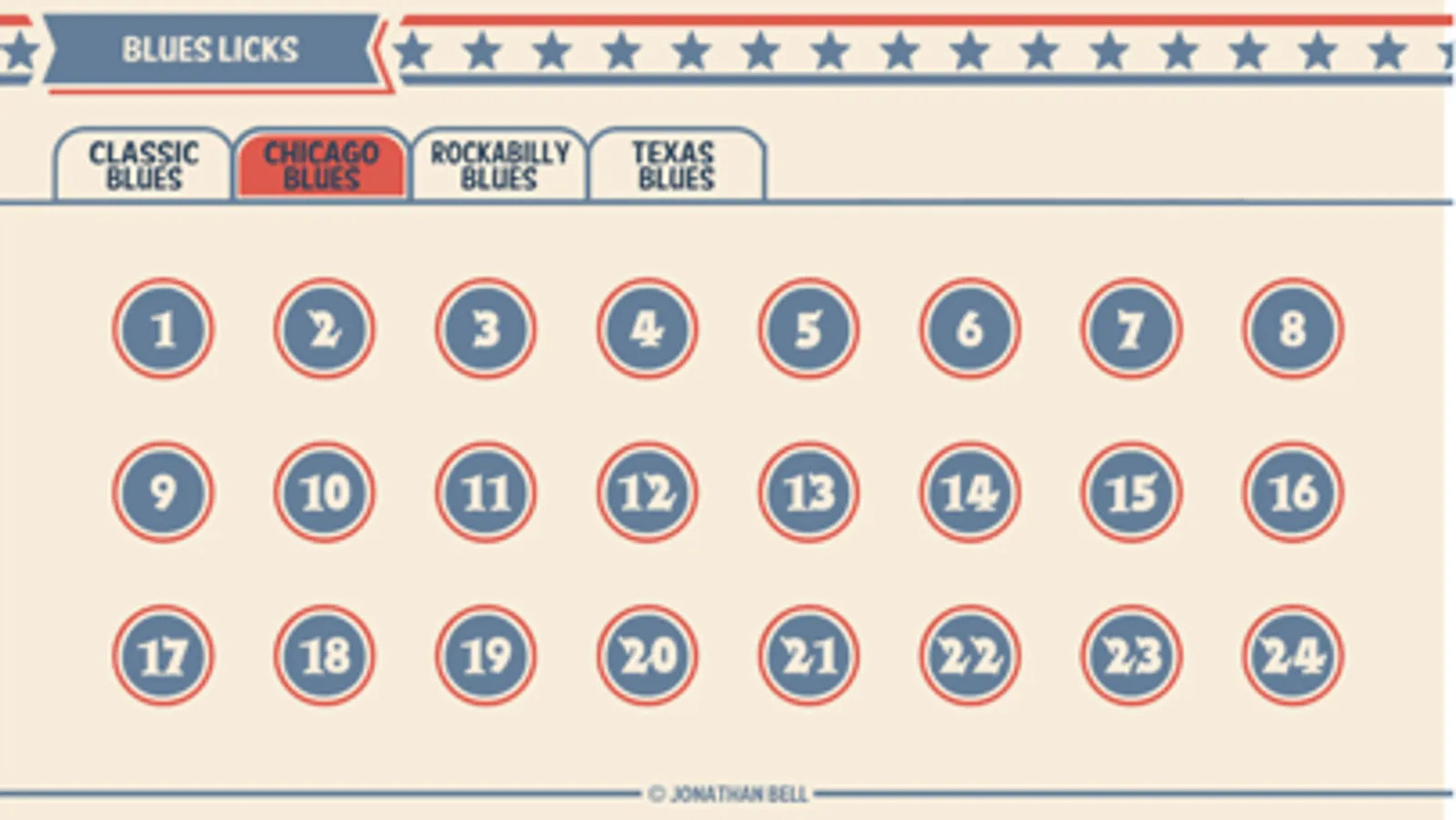 ● Learn licks in four styles: Classic blues, Texas blues, Chicago blues and Rockabilly blues.