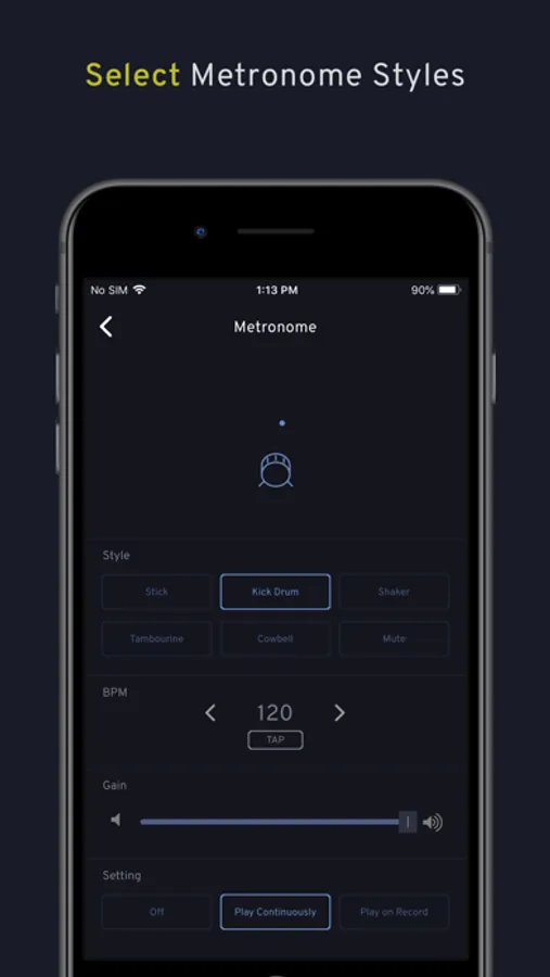 * Select from a wide variety of Metronome styles including stick, kick drum, shaker, tambourine and cowbell.