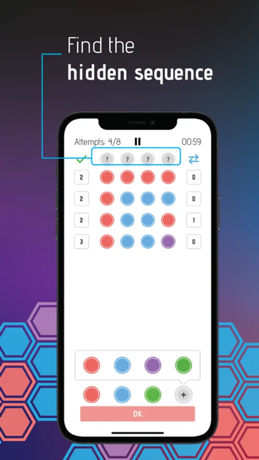 This is a puzzle-strategy game where you need to guess a sequence based on hints telling the player if the elements of the sequence is misplaced or not. There are several levels making the game more challenging with more positions and colors increasing the possibilities.