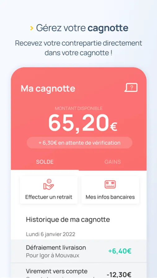 Une fois votre mission terminée et validée, vous recevez vos gains sur votre cagnotte, et pouvez les transférer vers votre compte bancaire à tout moment.