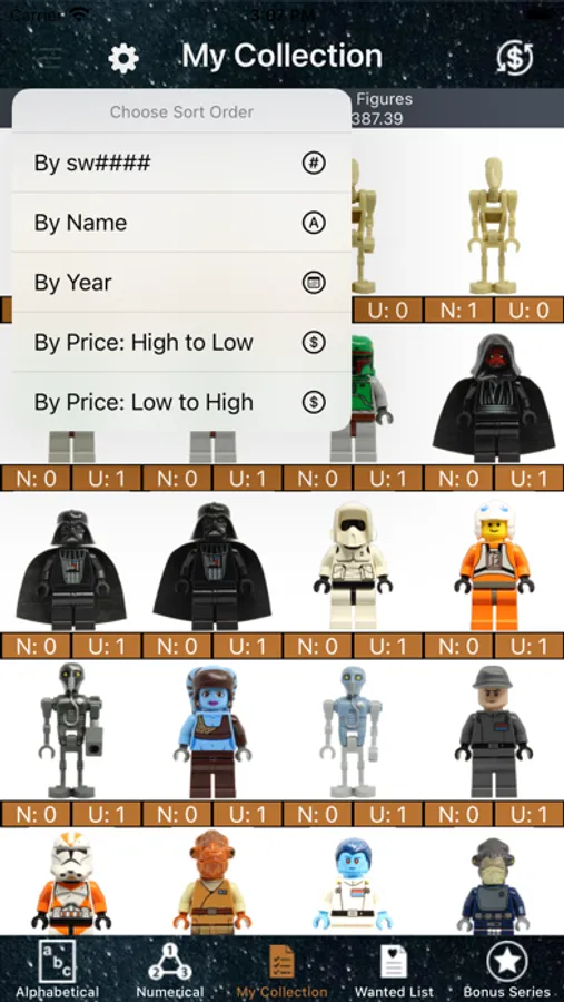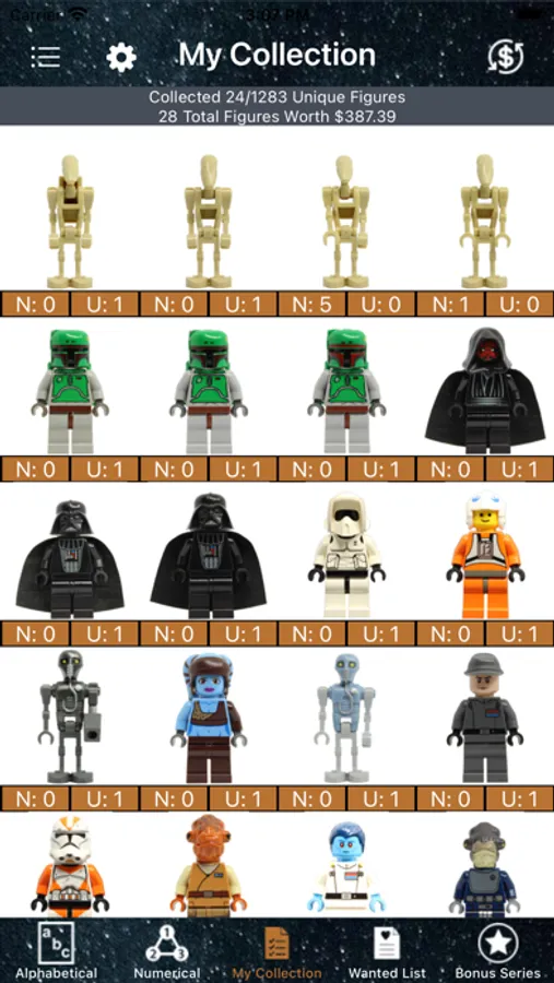 Each entry contains all of the important information about the minifigure including detailed images, unique ID, year of release, and in which sets it can be found. Swiping left and right allows you to see both the front and back of the minifigure. Clicking on the sets box shows exactly which sets a minifig comes from! LSW Collector allows you to 'check off' minifigures you already have and add the ones you don't to your wanted list. The green check mark allows you to easily see which minifigures you already have from the main view while the 'WANTED' symbol indicates which figures you are still chasing. Alternatively you can ignore figures that you don't want to have in your collection by tapping on the hide button at the bottom of the screen. You can revisit these figures any time by clicking the hide button on the main page. The Price Guide feature allows you to check the average selling price for each minifigure and can be used as an estimation for your own buying/selling purposes. You can also add multiple of the same minifigure to your collection and then track your total progress on the My Collection tab.