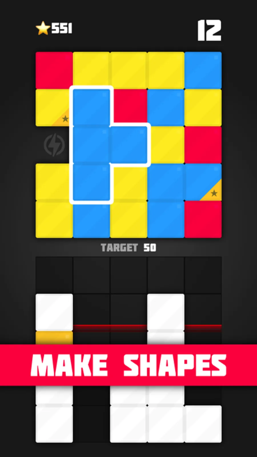 Slide blocks to make shapes. Drop shapes to score points. But be careful about where those shapes end up!