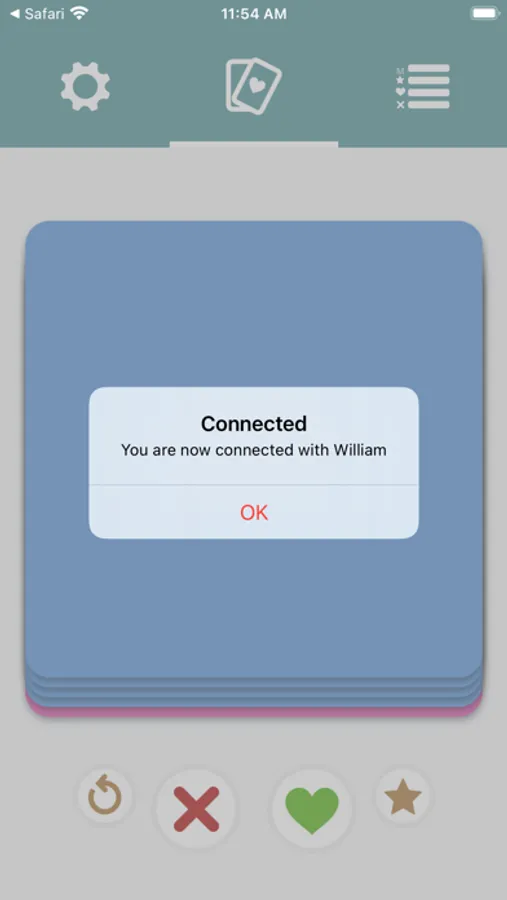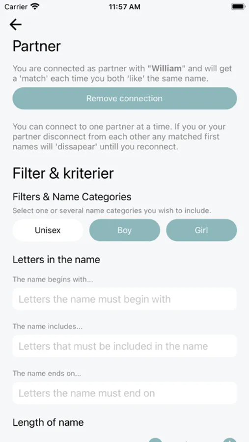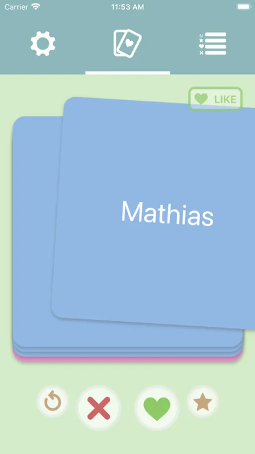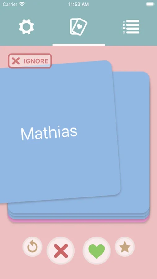 Swipe right to ‘like’ a name and swipe left to ‘ignore’ names you do not like. If you are connected with a partner* there will be a match when both you and your partner have liked the same name.