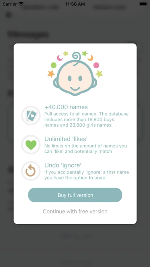 • ’Baby Name – Swipe & Match’ includes +44,000 unique names and the database is regularly updated. As a free user, you have access to 200 names to try the app