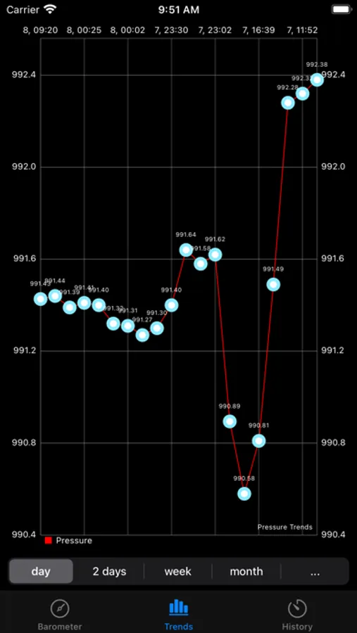 Application can collection atmosphere pressure during day for create logs and charts which can be used later.