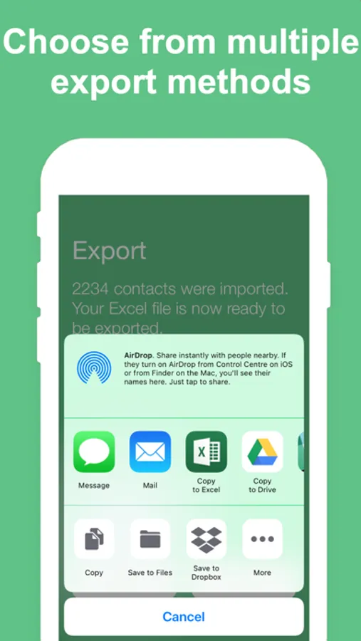 You can export the Excel file containing your contacts using email, SMS, iMessage, Dropbox, iCloud Drive, Slack, Evernote, and more. And of course, you can open the file directly in Excel if you have it installed on your iPhone or iPad.