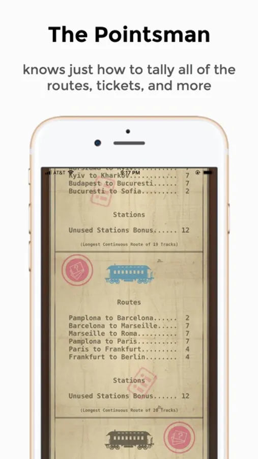 You can use the Pointsman during normal gameplay to confirm player scores, or just leave the scoring till the end and maximize your enjoyment! The Pointsman will tally up all player routes, route scores, station placements, longest train routes and other game specific bonuses, plus all destination tickets. Everything is presented on a beautiful “score ticket” you can share as a memento of your game.