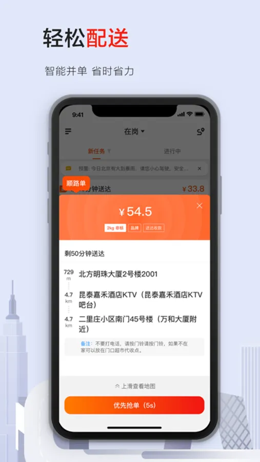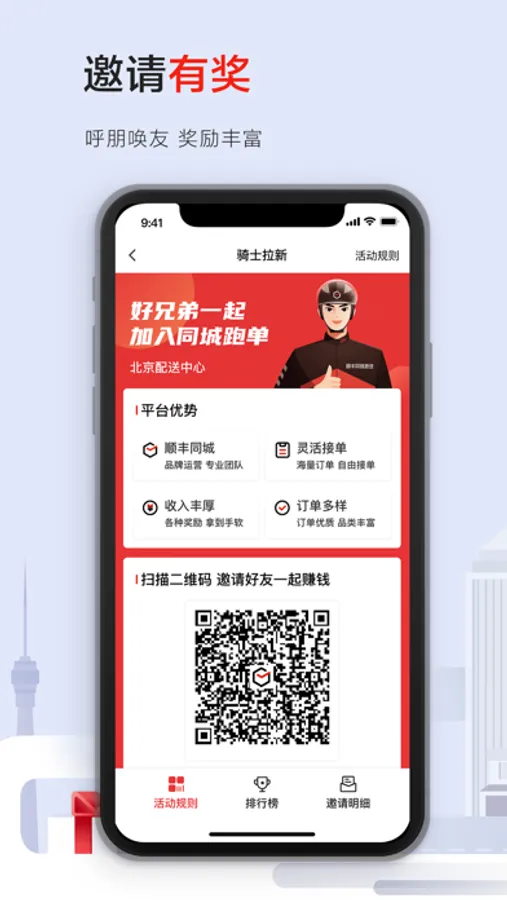 顺丰急送,专注同城配送的专业团队!打造同城物流专业配送平台!顺丰同城骑士APP是一款为顺丰同城配送员打造的赚钱好帮手,如果您时间零散,注册兼职,可以自由接单,自己做自己的老板,平台提供专业指导培训,单单结算,让您随时随地开赚;如果您时间充足,入职专职,大数据精确计算合理派单,轻松送货。顺丰同城骑士,海量订单等你来,月入过万,更有多重活动,助力收入!