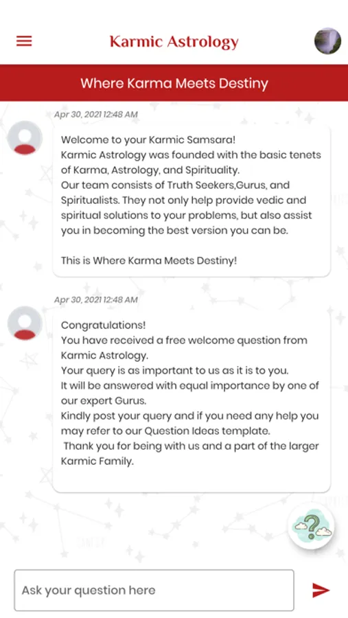 Karmic Astrology is an application based on the basic principles of the Vedas, Karma, Astrology and Spirituality where you can get your own personalized reading and predictions from our team of Truth seekers, Gurus and Spiritualists. Such readings are based on your unique natal birth chart and help to not only address your current troubles and hindrances but also in you becoming a better version of yourself as well.