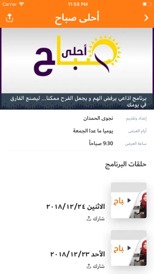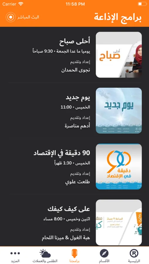 - صفحة البرامج التي تعرض لك كافة برامج اذاعة راية المميزة وامكانية الاستماع الى الحلقات المسجلة.