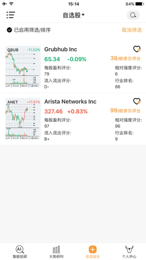 输入股票代码来查看每一只美股的盈利、价格强度、市场供求、所处产业集群强弱等股票评估信息。