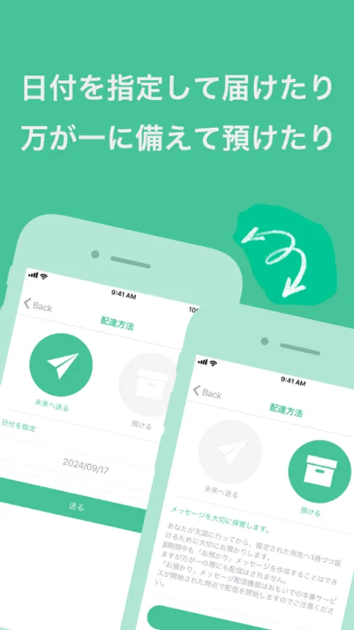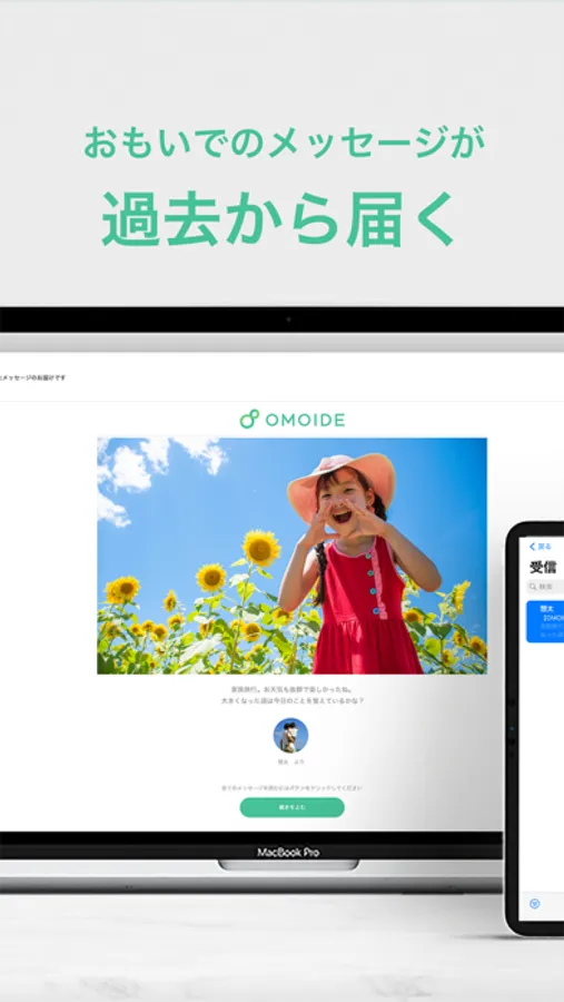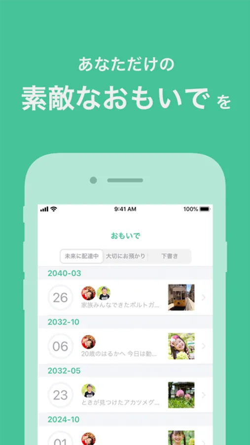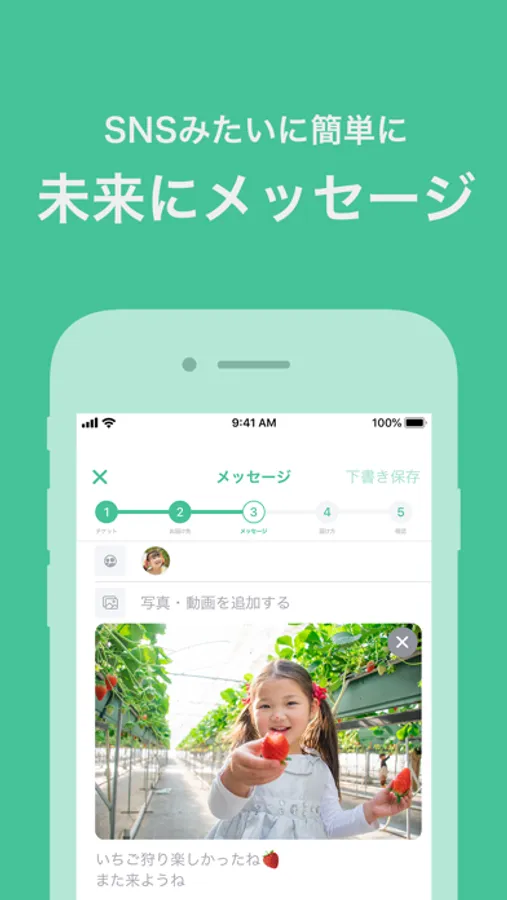 SNSに投稿するのと同じくらい簡単に、メッセージに写真や動画を添えて、あなたとあなたの大切な人の未来に届けます。